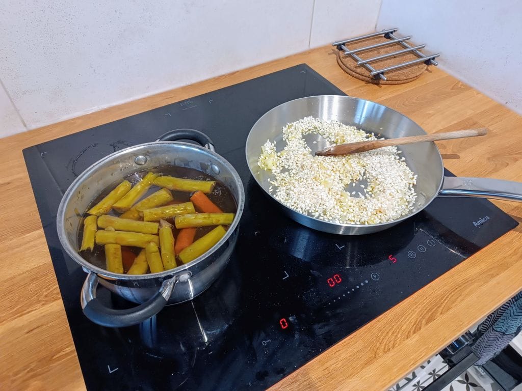 Aha…bulion do ryżu przygotowałem ze zdrewniałych końcówek szparagów. Nie warto ich wyrzucać. Możesz je pięknie wykorzystać w kuchni.