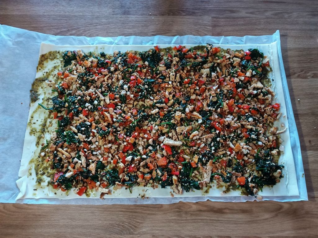 - Na posmarowane ciasto francuskie wyłóż farsz. Równomiernie na całej powierzchni. Zostaw tylko mały margines z jednej strony.